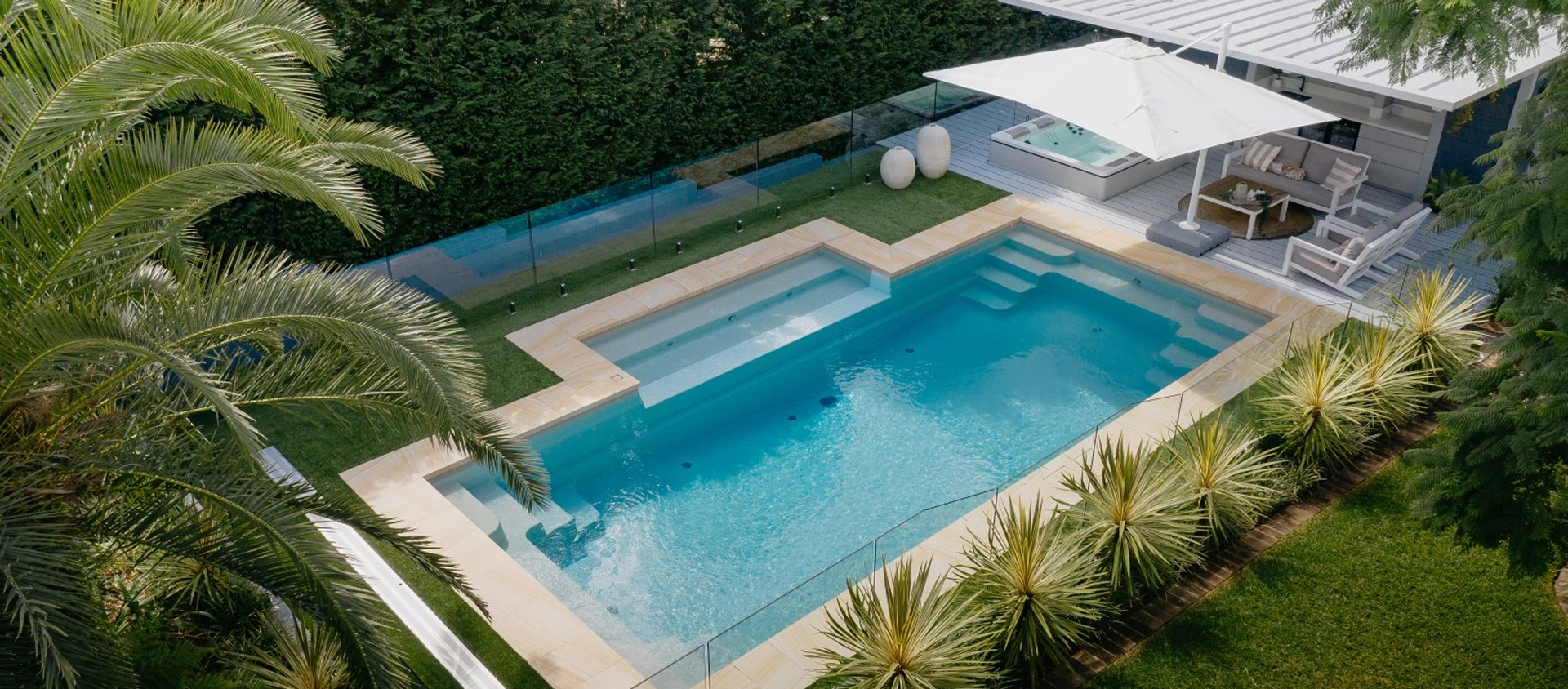 A modern geometric shape of our Sanctuary pools will fit most backyards. Ample space to take a dip while providing a full length bench and steps for relaxation and family fun.